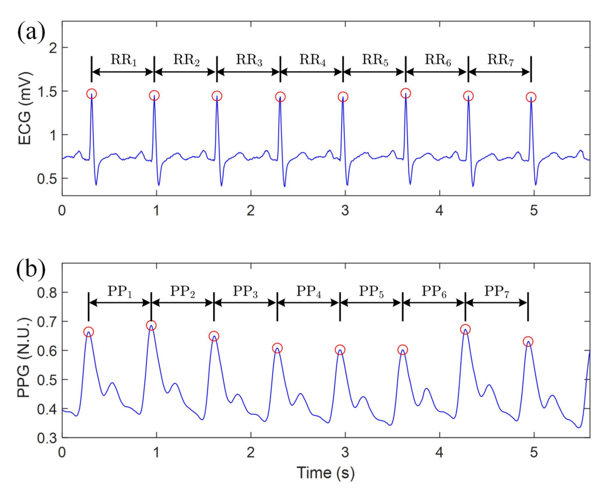 Illustration of deriving HRV data from ECG and PPG signals, (a) RR intervals in the ECG signal, and (b) PP intervals in the PPG signal. N.U.: Normalised units.