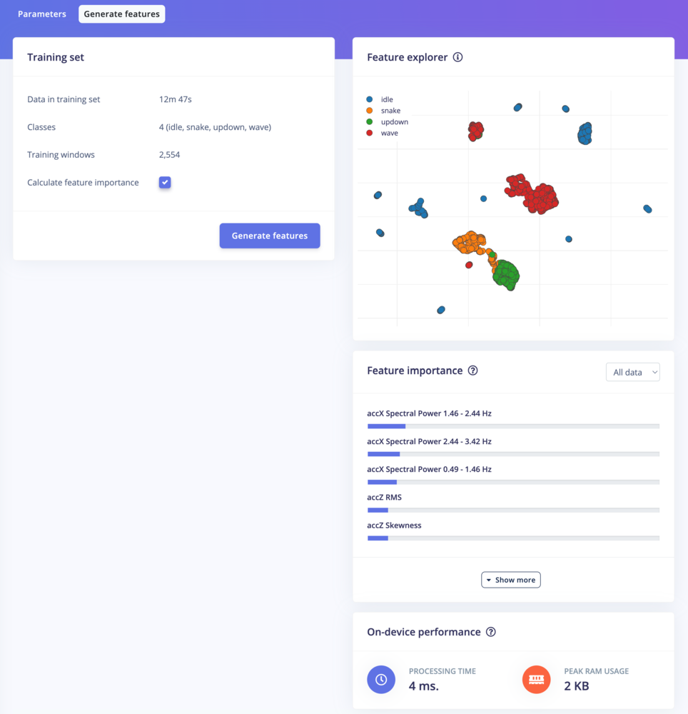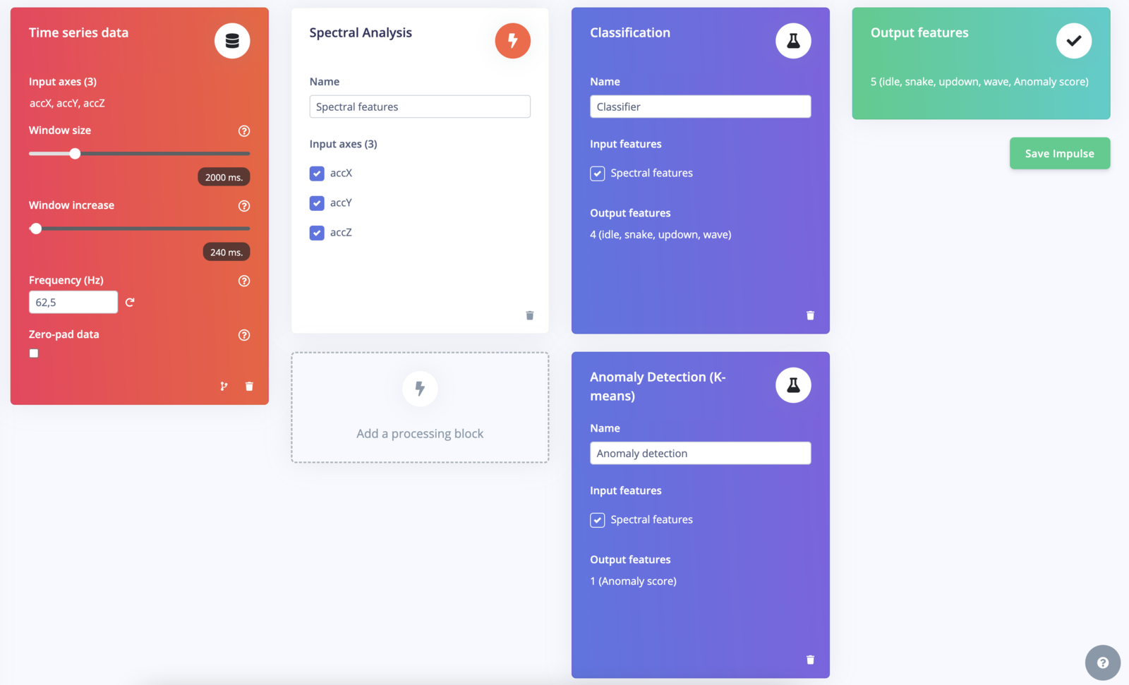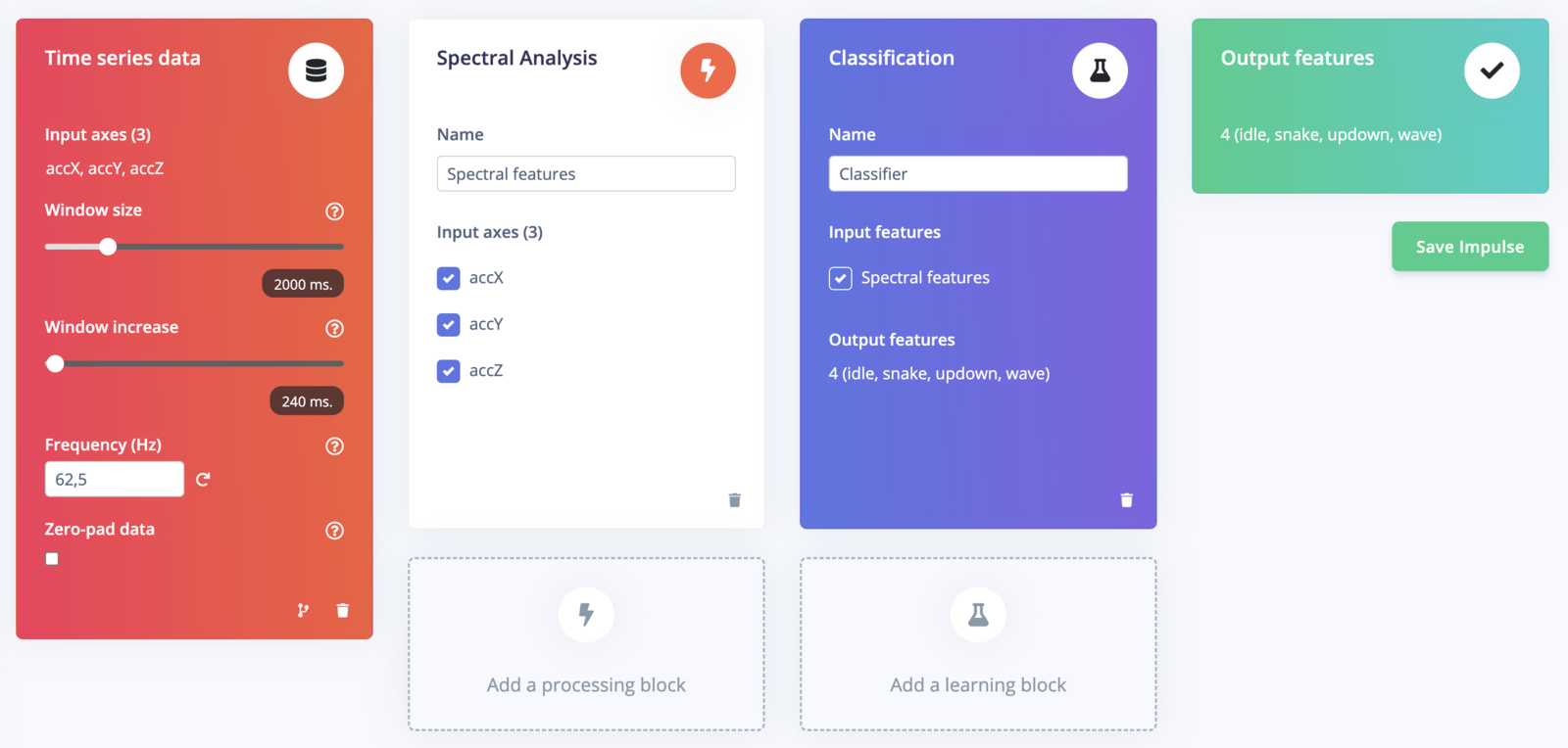 With the training set in place, you can design an impulse. An impulse takes the raw data, slices it up in smaller windows, uses signal processing blocks to extract features, and then uses a learning block to classify new data. Signal processing blocks always return the same values for the same input and are used to make raw data easier to process, while learning blocks learn from past experiences. For this tutorial we’ll use the ‘Spectral analysis’ signal processing block. This block applies a filter, performs spectral analysis on the signal, and extracts frequency and spectral power data. Then we’ll use a ‘Neural Network’ learning block, that takes these spectral features and learns to distinguish between the four (idle, snake, wave, updown) classes. In the studio go to Create impulse, set the window size to2000 (you can click on the 2000 ms. text to enter an exact value), the window increase to 80, and add the ‘Spectral Analysis’ and ‘Classification (Keras)’ blocks. Then click Save impulse.