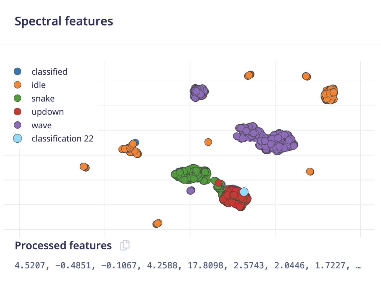 Neural networks are great, but they have one big flaw. They’re terrible at dealing with data they have never seen before (like a new gesture). Neural networks cannot judge this, as they are only aware of the training data. If you give it something unlike anything it has seen before it’ll still classify as one of the four classes. Let’s look at how this works in practice. Go to ‘Live classification’ and record some new data, but now vividly shake your device. Take a look and see how the network will predict something regardless. So, how can we do better? If you look at the feature explorer, you should be able to visually separate the classified data from the training data. We can use this to our advantage by training a new (second) network that creates clusters around data that we have seen before, and compares incoming data against these clusters. If the distance from a cluster is too large you can flag the sample as an anomaly, and not trust the neural network.