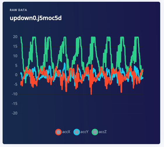 With your device connected, we can collect some data. In the studio go to the Data acquisition tab. This is the place where all your raw data is stored, and - if your device is connected to the remote management API - where you can start sampling new data. Under Record new data, select your device, set the label toupdown, the sample length to 10000, the sensor to Built-in accelerometer and the frequency to 62.5Hz. This indicates that you want to record data for 10 seconds, and label the recorded data as updown. You can later edit these labels if needed.