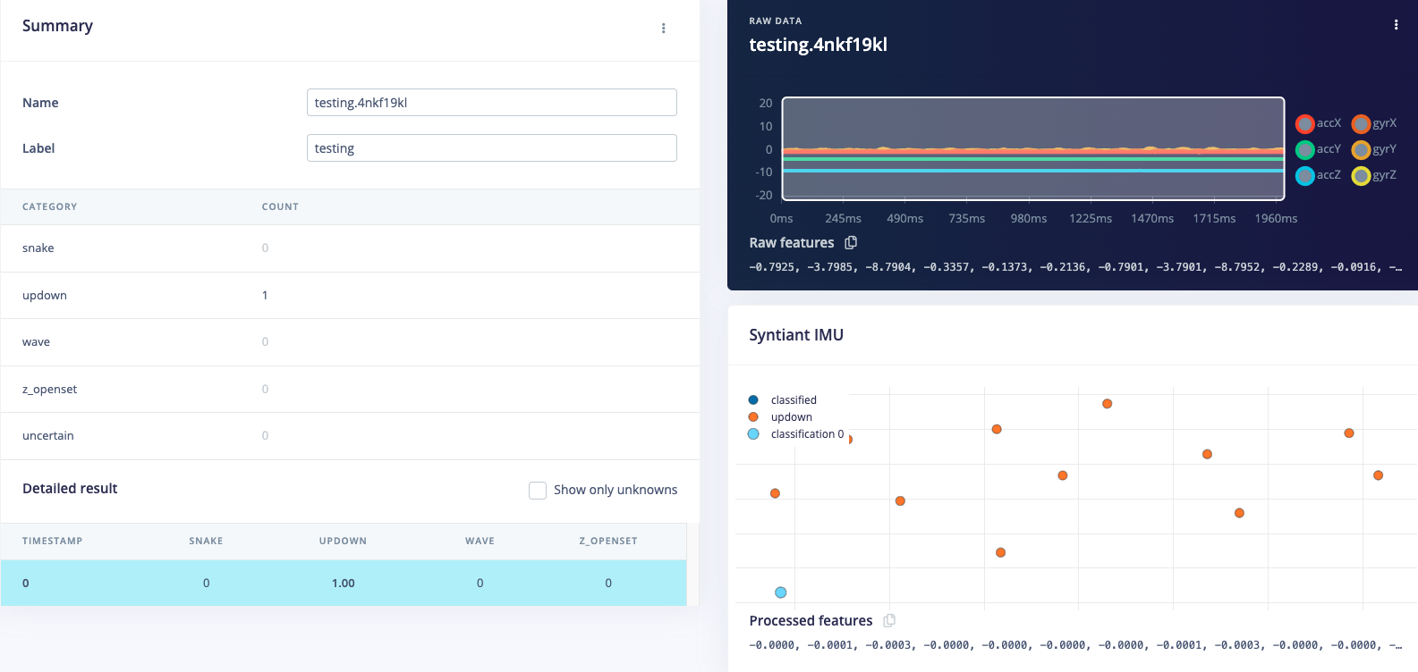 From the statistics in the previous step we know that the model works against our training data, but how well would the network perform on new data? Click on Live classification in the menu to find out. Your device should (just like in step 2) show as online under ‘Classify new data’. Set the ‘Sample length’ to `2000, click Start sampling and start doing movements. Afterward, you’ll get a full report on what the network thought that you did.