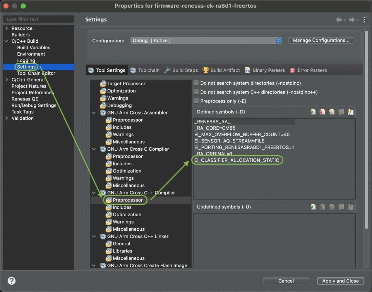 GNU Arm Cross C++ Compiler > Preprocessor. Under these settings, under ‘Defined symbols (-D)’, addEI_CLASSIFIER_ALLOCATION_STATICas an additional defined symbol. This is also shown below: