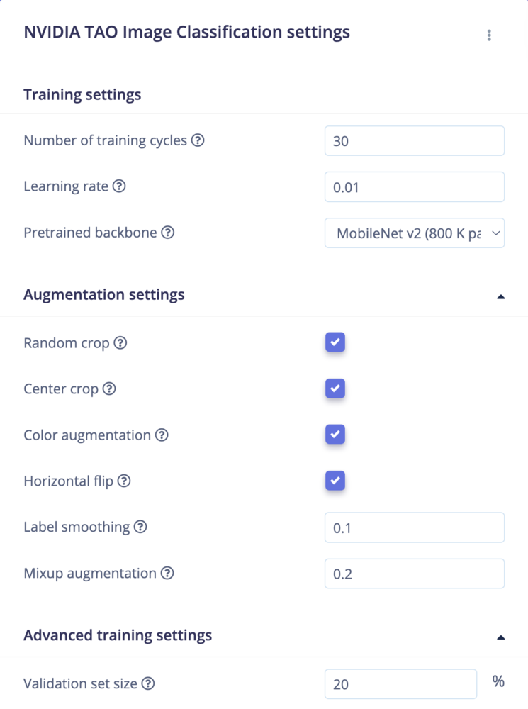 - There are pre-trained 3x224x224 backbones from the NVIDIA TAO catalog, and others trained by Edge Impulse on ImageNet.