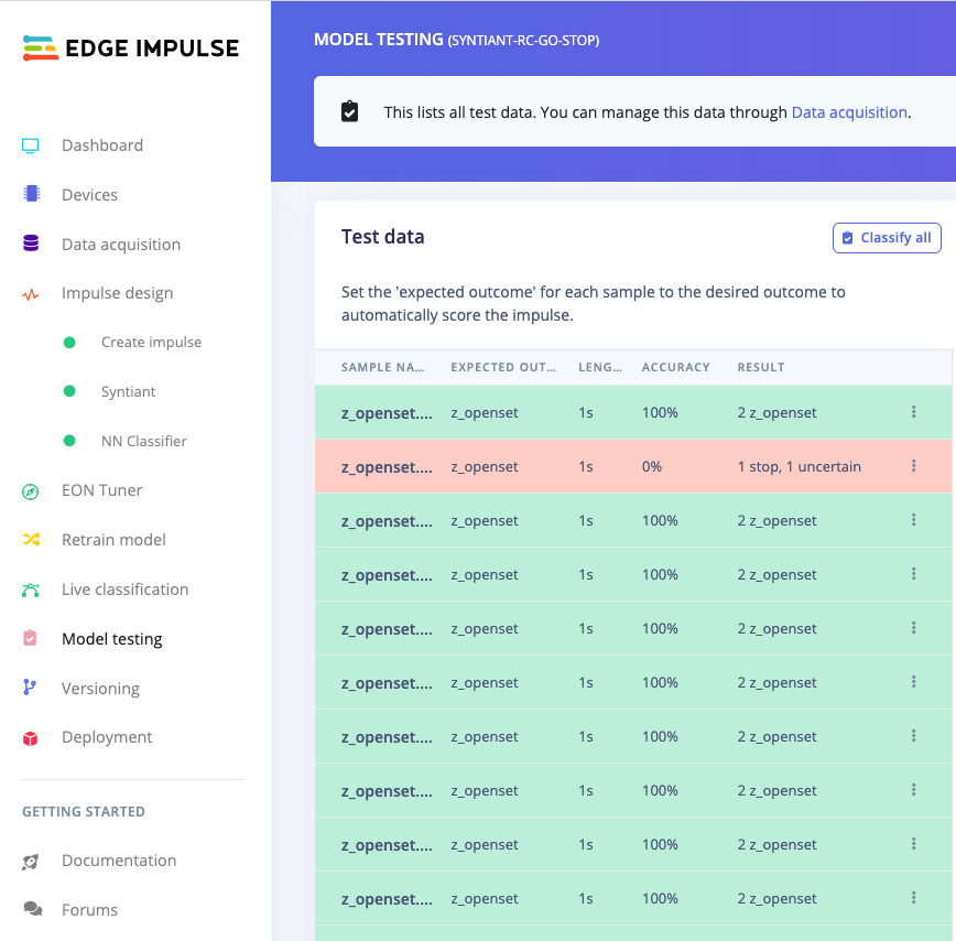 The performance numbers in the previous step show that our model is working well on its training data, but it’s extremely important that we test the model on new, unseen data before deploying it in the real world. This will help us ensure the model has not learned to overfit the training data, which is a common occurrence. Fortunately we’ve put aside 20% of our data already in the ‘Test set’ (see Data acquisition). This is data that the model has never seen before, and we can use this to validate whether our model actually works on unseen data. To run your model against the test set, head to Model testing, and click Classify all.
