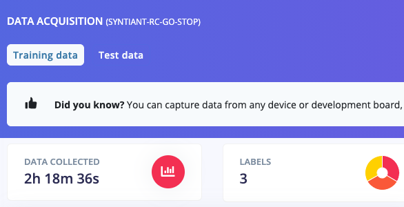 Before starting the tutorialAfter signing up for a free Edge Impulse account, clone the finished project, including all training data, signal processing and machine learning blocks here: Tutorial: Syntiant-RC. At the end of the process you will have the full project that comes pre-loaded with approx. 2.5 hours of training data.The features have been generated for the Syntiant TinyML board. To use it for the Arduino Nicla Voice, just set the