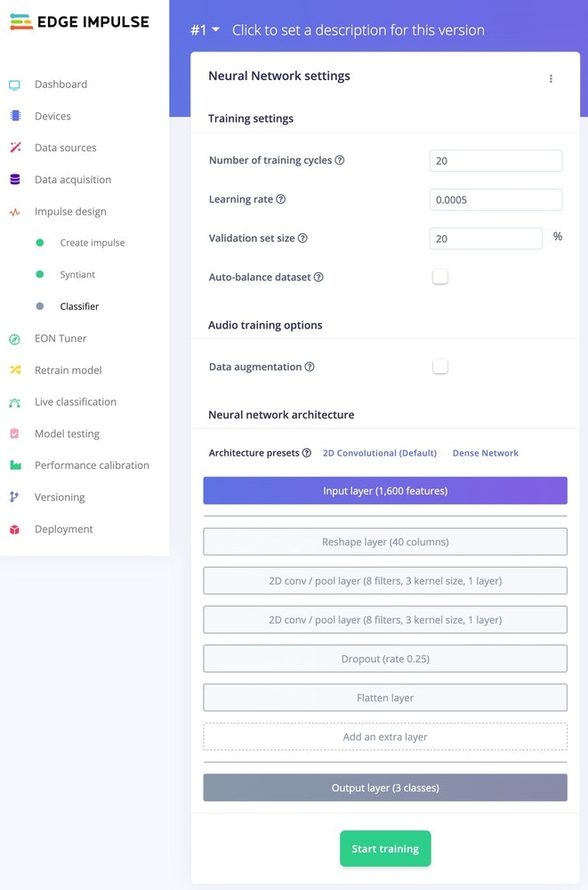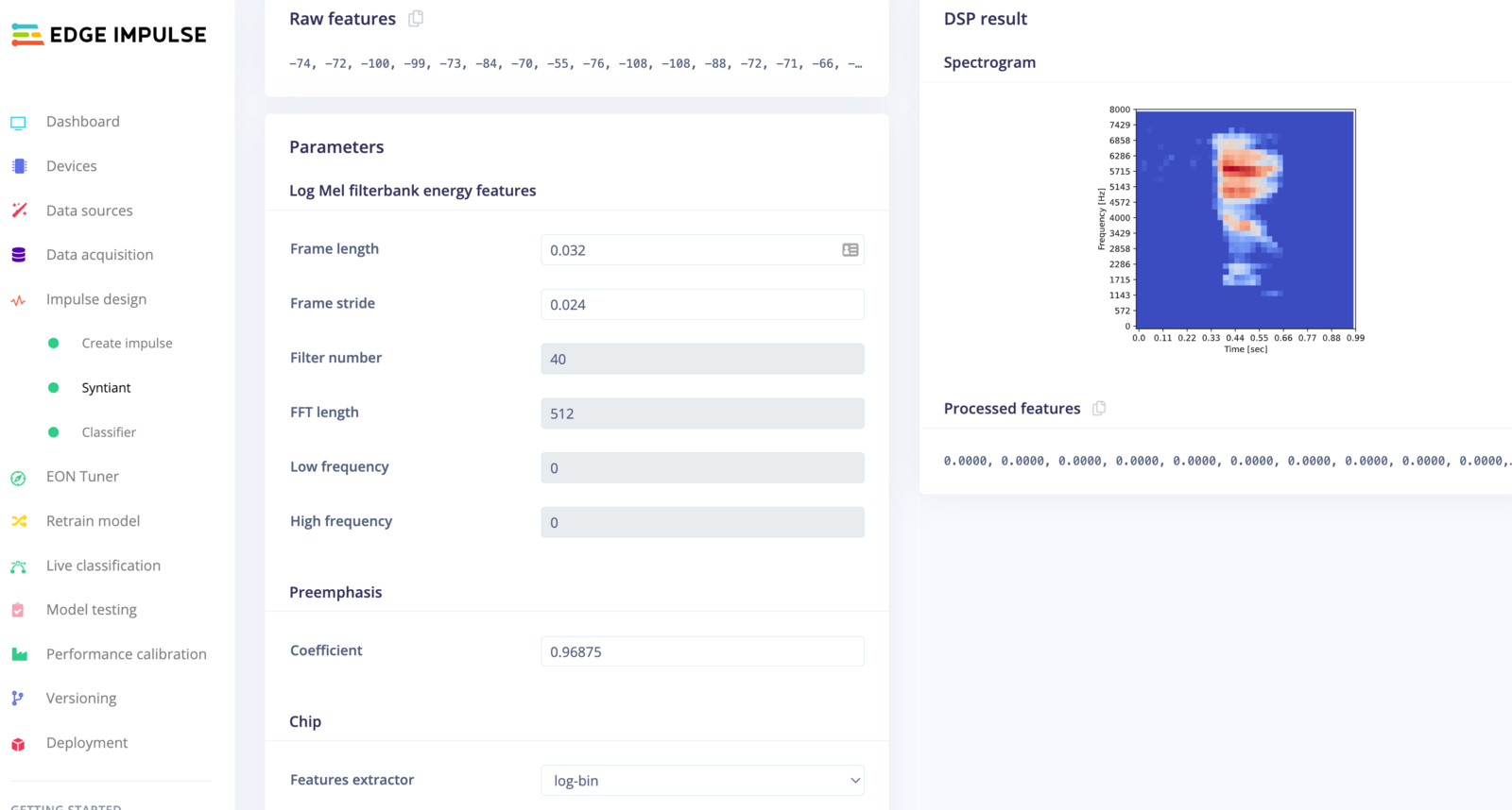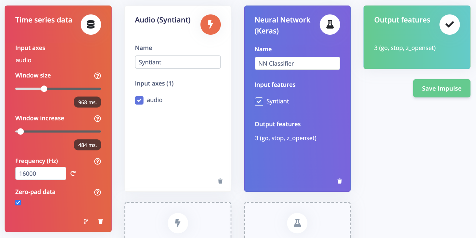 Now that we’ve assembled the building blocks of our Impulse, we can configure each individual part. Click on the Syntiant tab in the left hand navigation menu. You’ll see a page that looks like this: