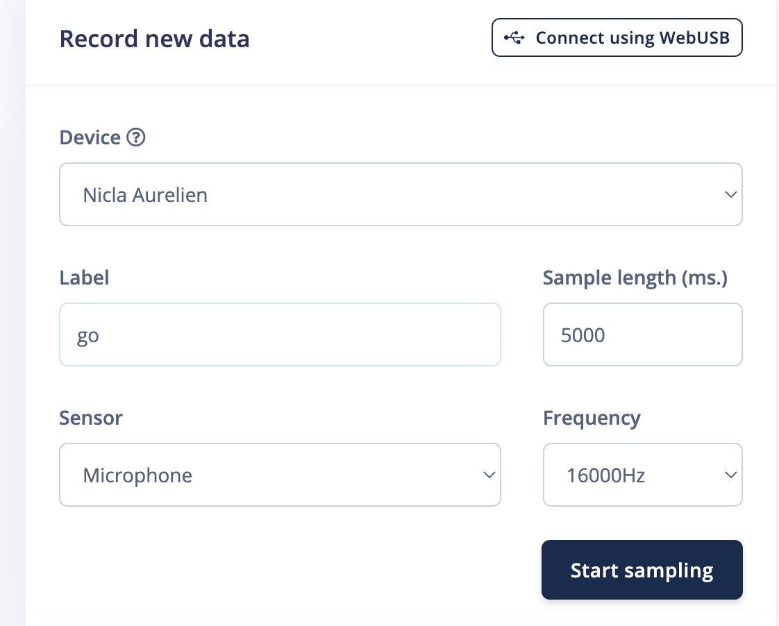 To collect your own voice samples, ensure you have selected your system’s microphone interface as the “Arduino MKRZero”. Then, go to Devices -> Connect a new device, and choose the option of “Use Your Computer” and allow access to your microphone.