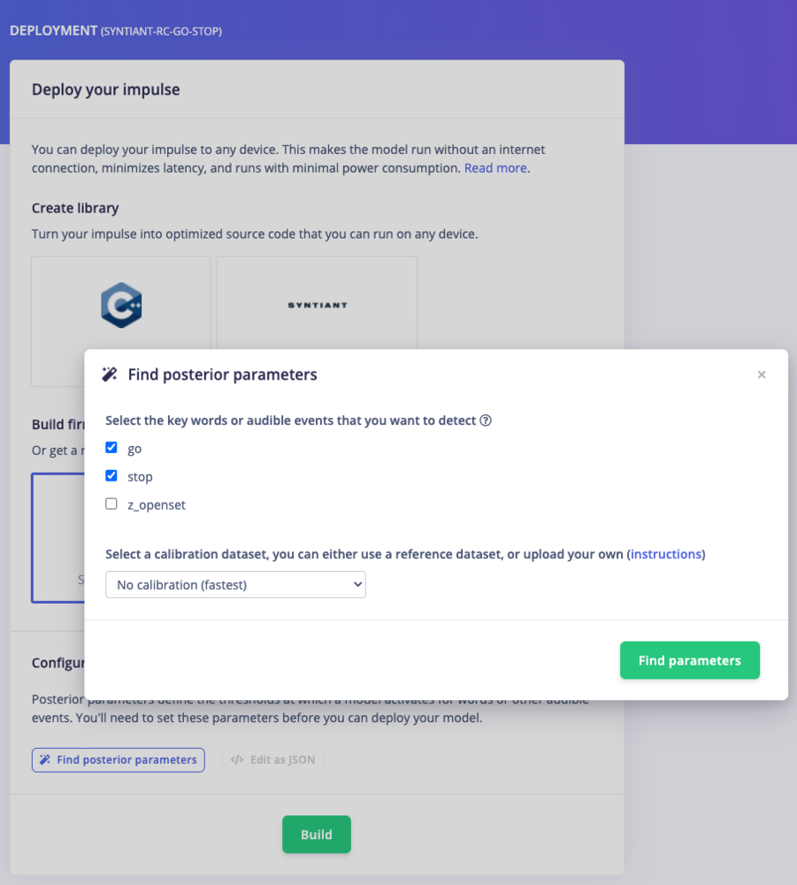 With the impulse designed, trained and verified you can deploy this model back to your device. This makes the model run without an internet connection, minimizes latency, and runs with minimum power consumption. To export your model, click on Deployment in the menu. Then under ‘Build firmware’ select the Syntiant TinyML or Arduino Nicla Voice. The final step before building the firmware is to configure the posterior handler parameters of the Syntiant chip.Pre-configured posterior parametersFor the Syntiant-RC project, we’ve already pre-configured the posterior parameters so you can just go to the ‘Build’ output step. We recommend skipping to Step 9, but read on for more details about the process of posterior search.