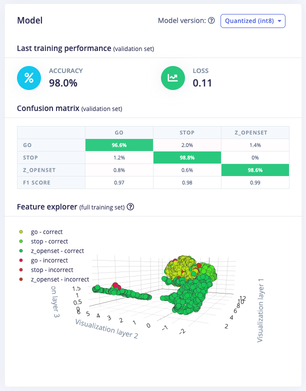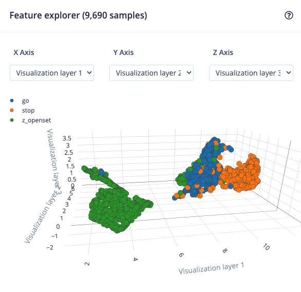 The spectrograms generated by the Syntiant block will be passed into a neural network architecture that is particularly good at learning to recognize patterns in this type of tabular data. Before training our neural network, we’ll need to generate Syntiant blocks for all of our windows of audio. To do this, click the Generate features button at the top of the page, then click the green Generate features button. This will take a minute or so to complete. Afterwards you’re presented with one of the most useful features in Edge Impulse: the feature explorer. This is a 3D representation showing your complete dataset, with each data-item color-coded to its respective label. You can zoom in to every item, find anomalies (an item that’s in a wrong cluster), and click on items to listen to the sample. This is a great way to check whether your dataset contains wrong items, and to validate whether your dataset is suitable for ML (it should separate nicely).