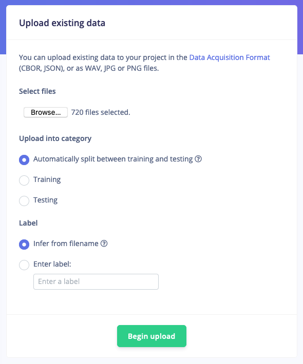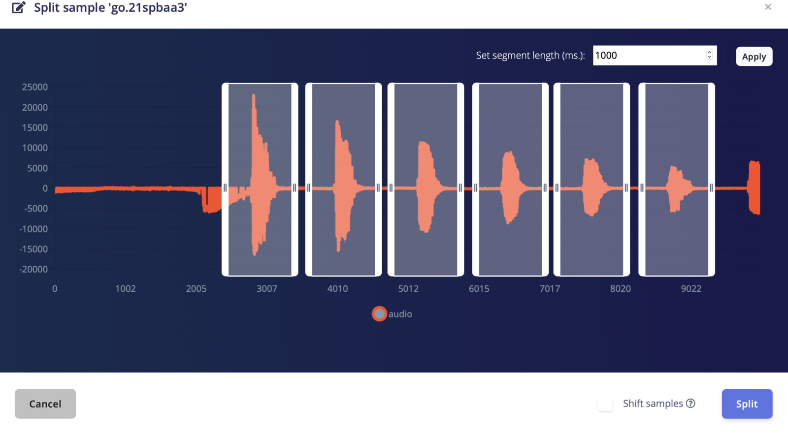 Note: You can use your Mobile phone as a sensor as well.Afterwards you have a file like this, clearly showing your keywords, separated by some noise. The new data sample will show up in the appropriate Training or Test data bucket.