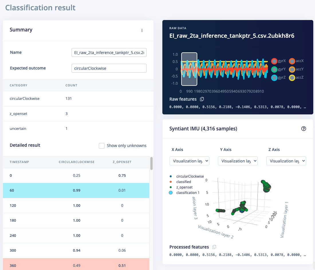 From the statistics in the previous step we know that the model works against our training data, but how well would the network perform on new data? Click on Live classification in the menu to find out. Your device should (just like in step 2) show as online under ‘Classify new data’. Set the ‘Sample length’ to2000 (5 seconds), click Start sampling and start doing movements. Afterward, you’ll get a full report on what the network thought that you did.