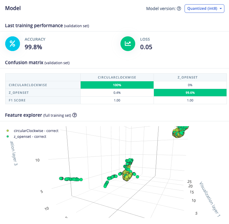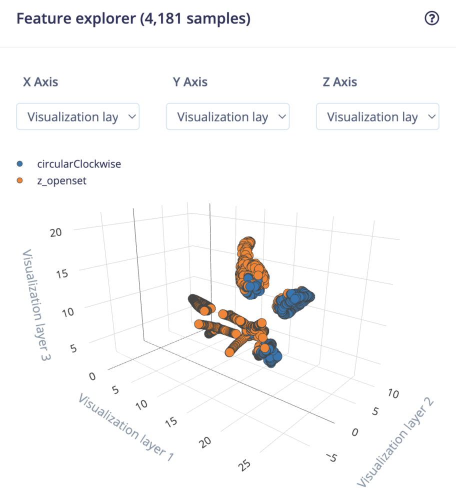 Afterwards the ‘Feature explorer’ will load. This is a plot of all the extracted features against all the generated windows. You can use this graph to compare your complete data set. A good rule of thumb is that if you can visually separate the data on a number of axes, then the machine learning model will be able to do so as well.