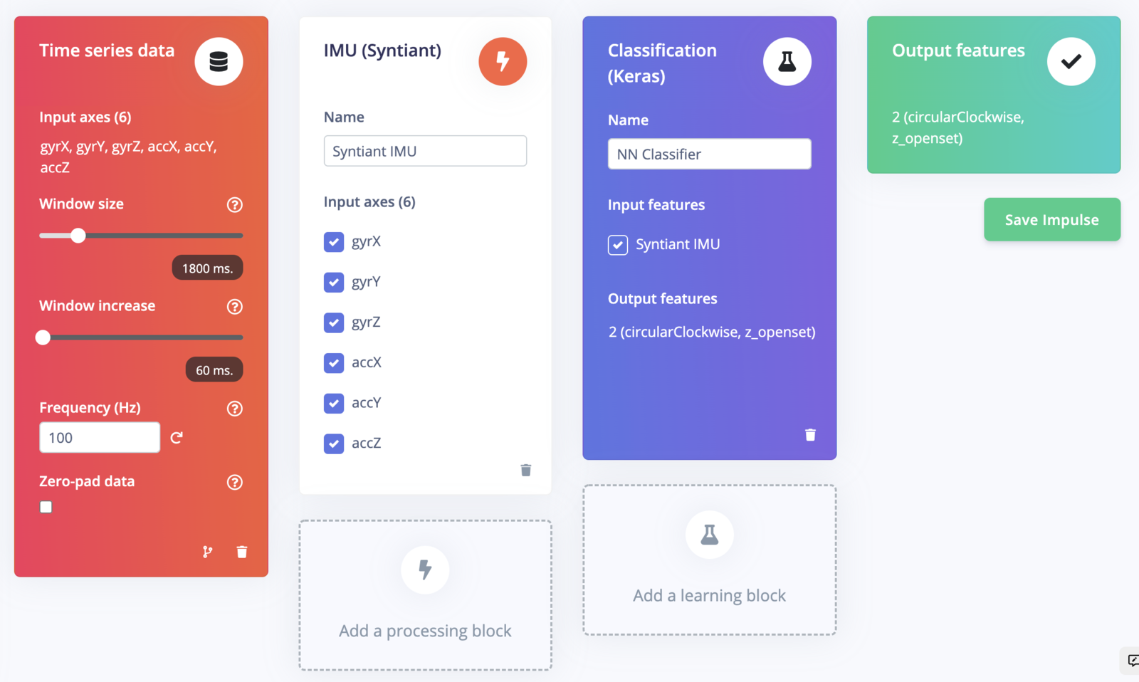 With the training set in place you can design an impulse. An impulse takes the raw data, slices it up in smaller windows, uses signal processing blocks to extract features, and then uses a learning block to classify new data. Signal processing blocks always return the same values for the same input and are used to make raw data easier to process, while learning blocks learn from past experiences. For this tutorial we’ll use the ‘IMU Syntiant’ signal processing block. This block rescales raw data to 8 bits values to match the NDP chip input requirements. Then we’ll use a ‘Neural Network’ learning block, that takes these generated features and learns to distinguish between our different classes (circular or not). In the studio go to Create impulse, set the window size to1800 (you can click on the 1800 ms. text to enter an exact value), the window increase to 80, and add the ‘IMU Syntiant’ and ‘Classification (Keras)’ blocks. Then click Save impulse.
