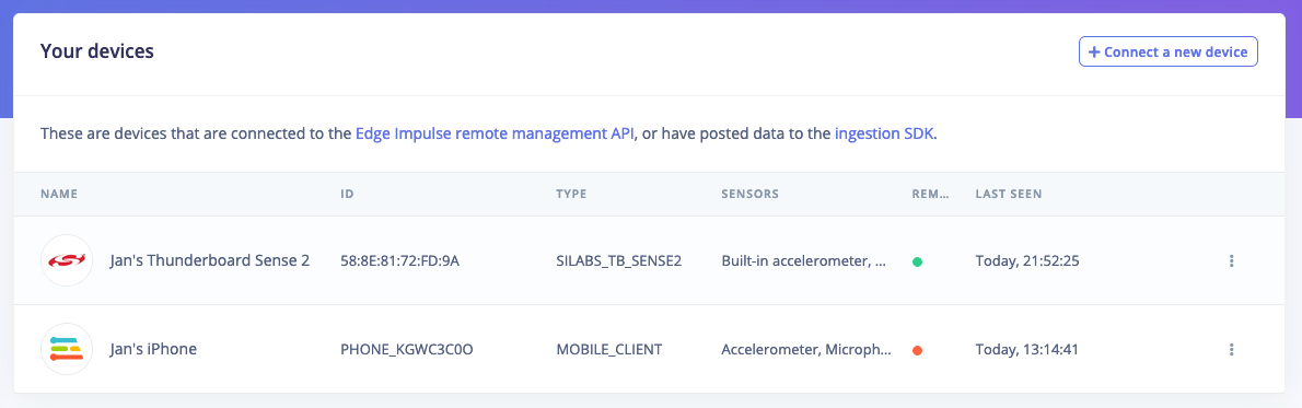 Devices tab with the device connected to the remote management interface.