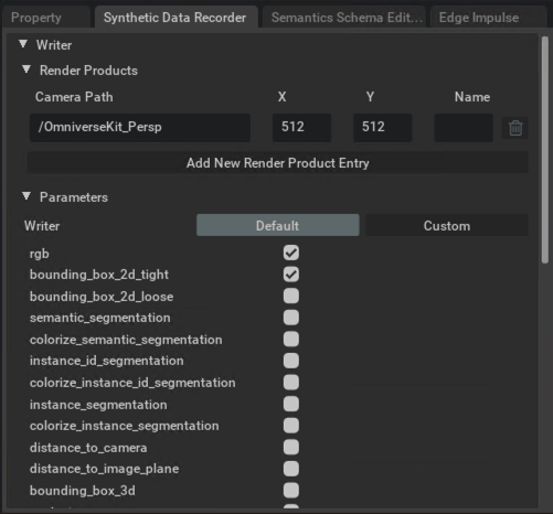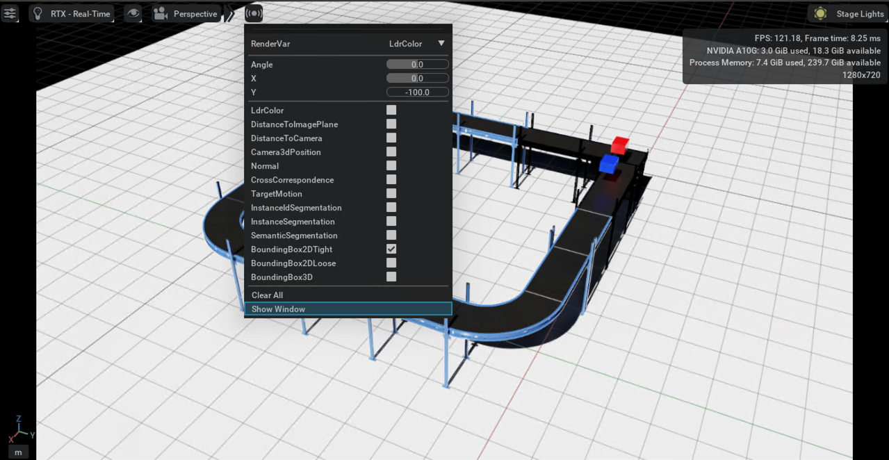 In order to collect bounding box data from your scene, semantic information for the objects of interest must be specified. A comprehensive guide on how to do this can be found here. To preview your bounding boxes, click on the icon to the right of the camera perspective button, select either tight or loose 2D bounding boxes and then “Show Window”.