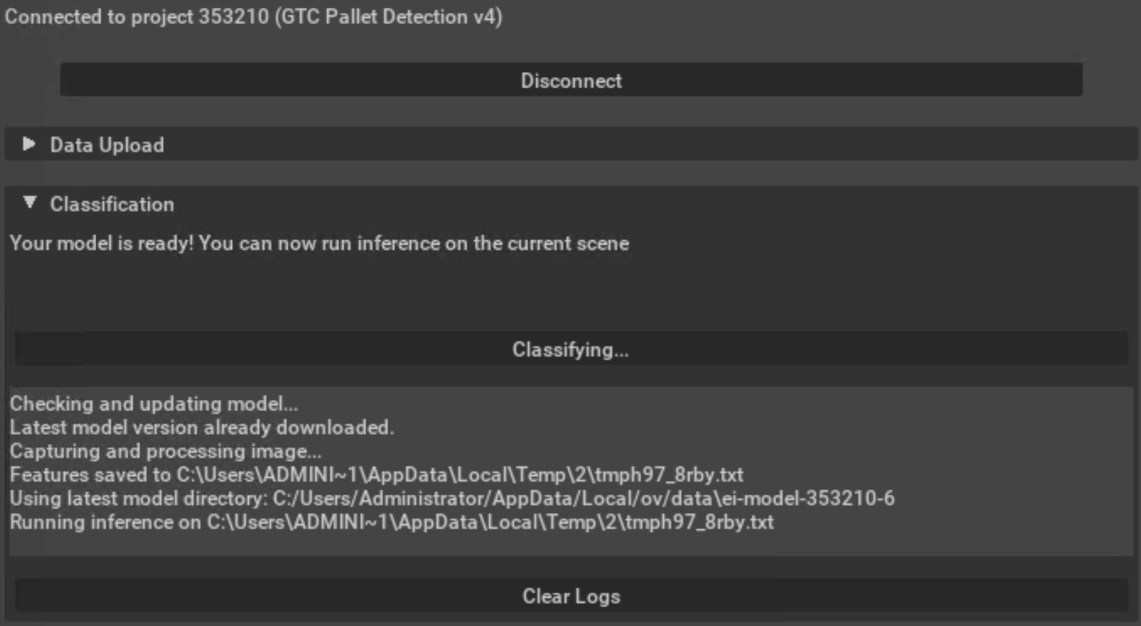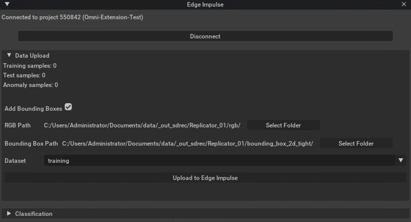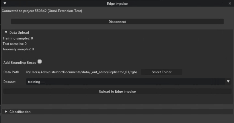 - Once your project is connected to your Edge Impulse Omniverse extension, select either the Data Upload or Classification drop-downs: