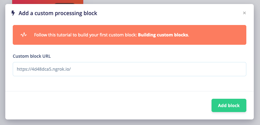As this block is running locally the studio cannot reach the block. To resolve this we can use ngrok which can make a local port accessible from a public URL. After you’ve finished development you can move the processing block to a server with a publicly accessible address (or run it on our infrastructure through your enterprise account). To set up a tunnel:- Sign up for ngrok.