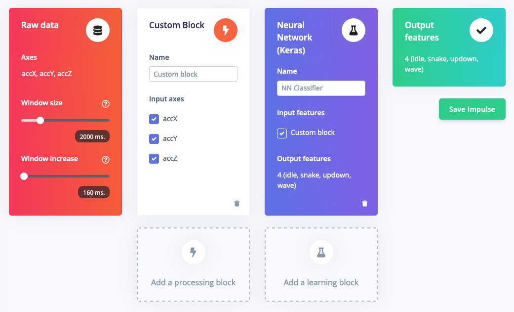 Make sure you follow the Continuous motion recognition tutorial, and have a trained impulse.Development flowThis tutorial shows you the development flow of building custom processing blocks, and requires you to run the processing block on your own machine or server. Enterprise customers can share processing blocks within their organization, and run these on our infrastructure. See custom processing blocks for more details.