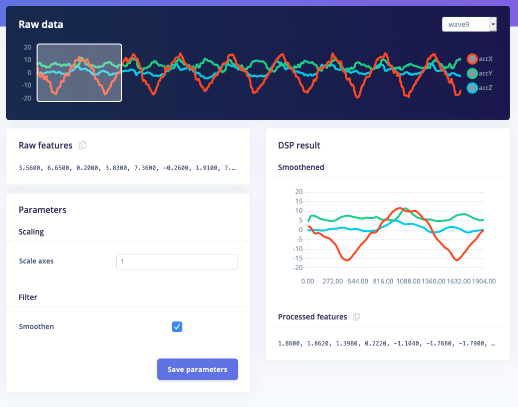 With good feature extraction you can make your machine learning models smaller and more reliable, which are both very important when you want to deploy your model on embedded devices. With custom processing blocks you can now develop new feature extraction pipelines straight from Edge Impulse. Whether you’re following the latest research, want to implement proprietary algorithms, or are just exploring data. For inspiration we have published all our own blocks here: edgeimpulse/processing-blocks. If you’ve made an interesting block that you think is valuable for the community, please let us know on the forums or by opening a pull request. We’d be happy to help write efficient native code for the block, and then publish it as a standard block!Parameters.json format