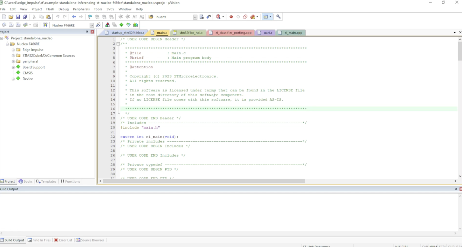The file extension is *.UVPROJ for MDK version 4, or *.UVPROJX for later versions. First open the standalone example project in Arm Keil µVision and follow the steps below to import the Edge Impulse SDK pack into your project. standalone_nucleo.uvguix.projx example-standalone-inferencing-stm32h747i-disco-CM7.uvprojx
