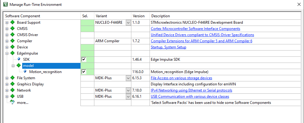 - Cmsis->Manage Software Components.->Software Packs:all packs->Search for EdgeImpulse SDK