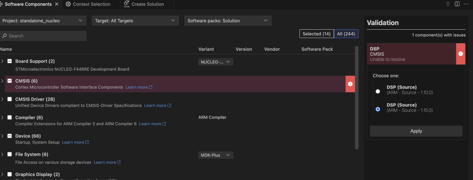 - Open VS Code and navigate to the ctl+shift+p >CMSIS: Manage Software Components.