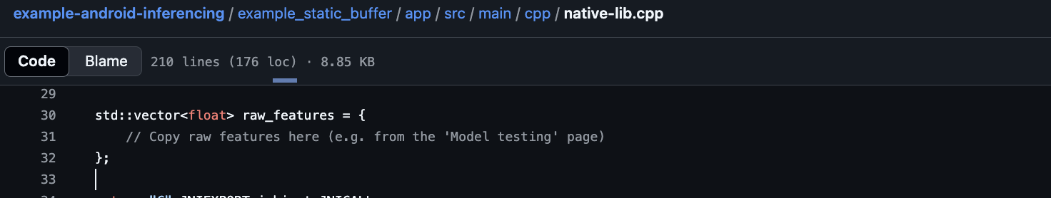Unzip your Edge Impulse C++ Library export. Copy these folders into your project’sapp/src/main/cpp/ directory: