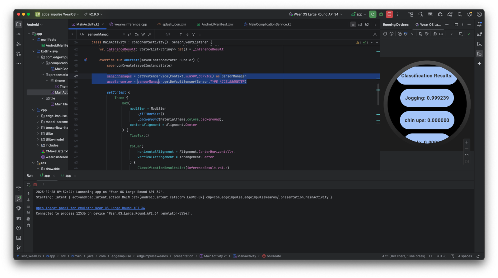 The WearOS example is a simple application that uses the accelerometer sensor to collect data, and run the impulse on the device. The application will show the result of the inference on the screen.