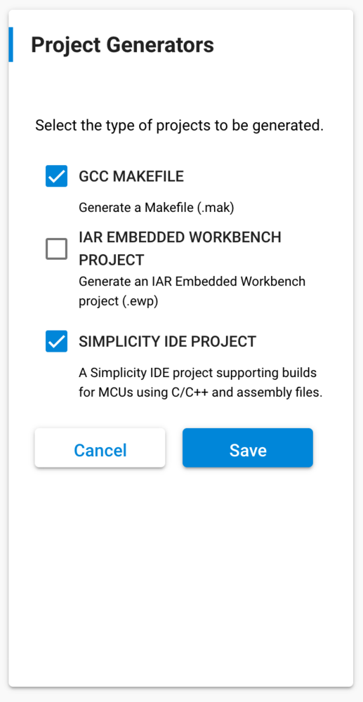 example-standalone-inferencing-silabs-tb-sense-2.slcpto show the Simplicity Configurator. - Edit ‘Project Generators’ and disable ‘IAR EMBEDDED WORKBENCH PROJECT’ (if it’s listed):