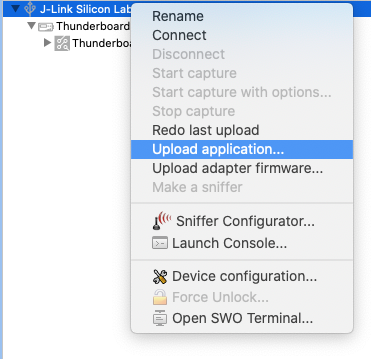 - Then, right click on the development board in the Debug adapters section of Simplicity Studio and select Upload application.