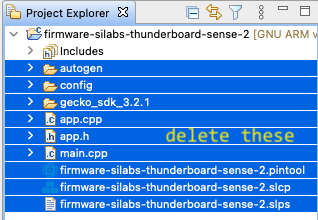 - Under ‘Project Explorer’ select all files, except for Includes and delete them: