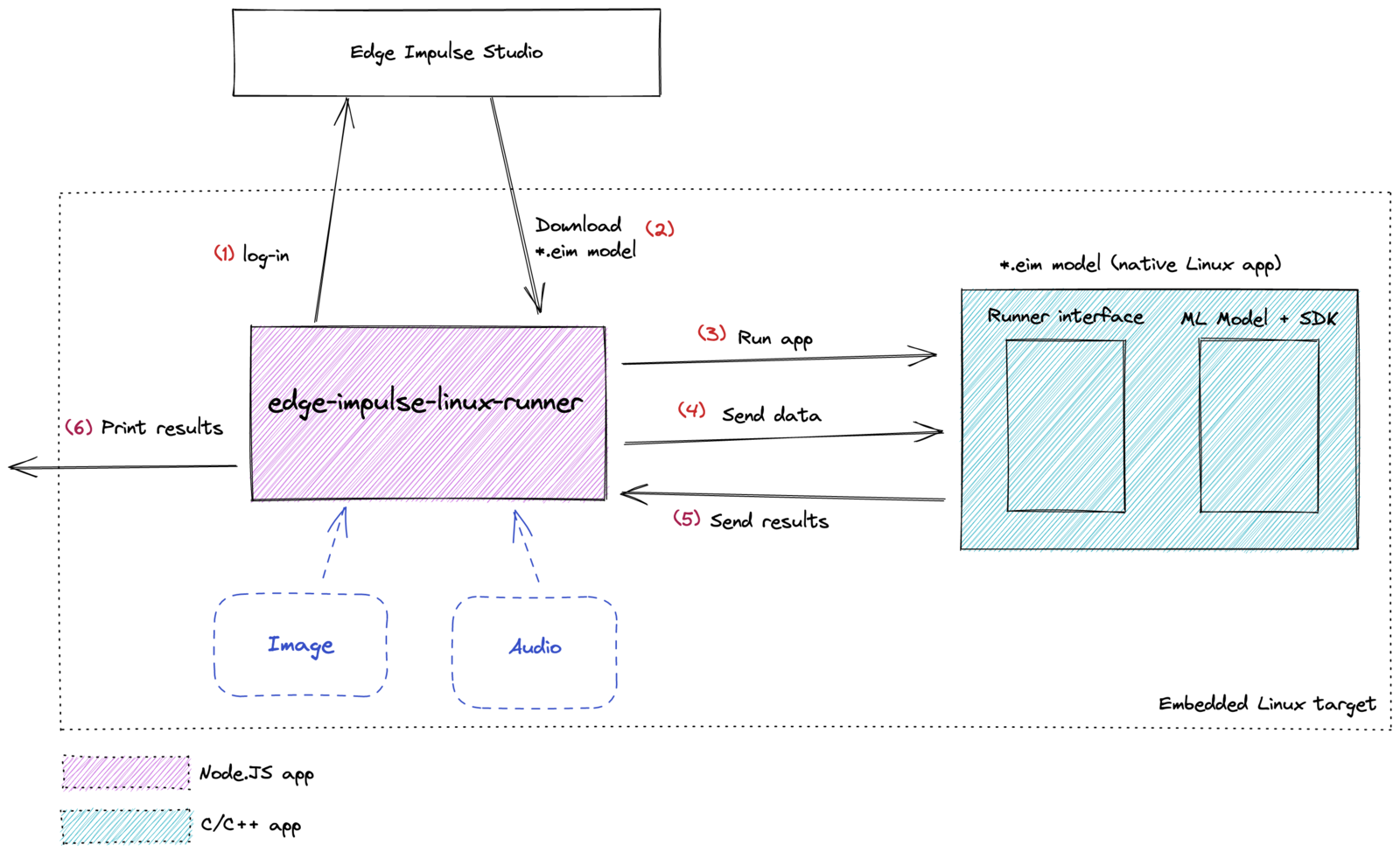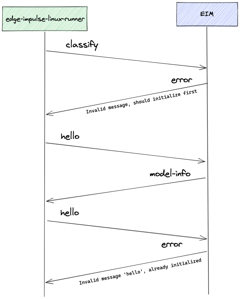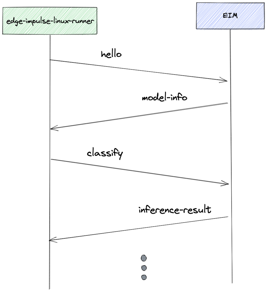JSON frames are used to pass data to and from the EIM executable running on your system. They can be transferred via Unix-like sockets (what edge-impulse-linux-runner uses) or standard input/output (stdio). Example frames are given below. An example dataflow of how such JSON messages are passed between the runner and EIM executable is shown below: