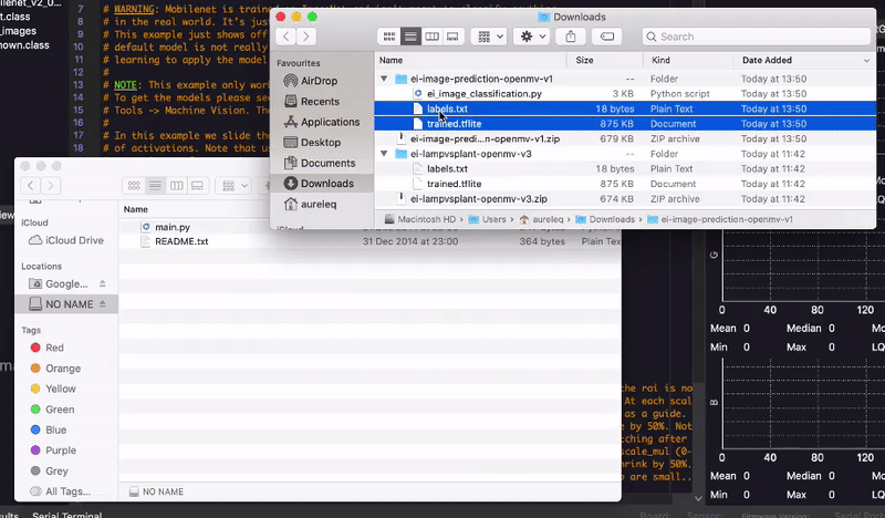 This method only works on small image classification models, if you run into a memory issue, please head to Deploying your impulse as an OpenMV firmware section (preferred method). Head over to your Edge Impulse project, and go to Deployment. From here you can create the full library which contains the impulse and all external required libraries. Select OpenMV library and click Build to create the library. Then download and extract the .zip file. To add the model to your OpenMV camera copy thetrained.tflite and labels.txt files to the ‘OpenMV Cam’ volume (like a USB drive).