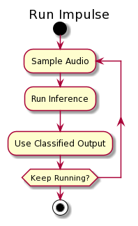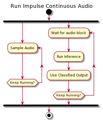 In the standard way of running the impulse, the steps of collecting data and running the inference are run sequentially. First, the audio is sampled, filling a block the size of the model. This block is sent to the inferencing part, where first the features are extracted and then the inference is run. Finally, the classified output is used in your application (by default the output will be printed over the serial connection).