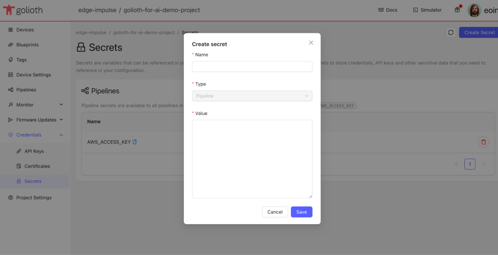 https://console.golioth.io/org/<organization>/project/<application>/secrets - Add your AWS credentials (Access Key ID and Secret Access Key) and the S3 bucket details to the Golioth secret store.