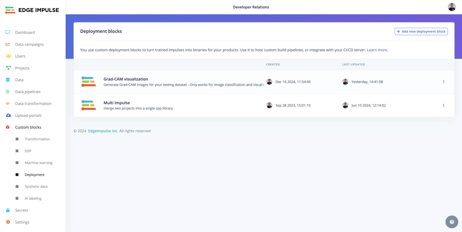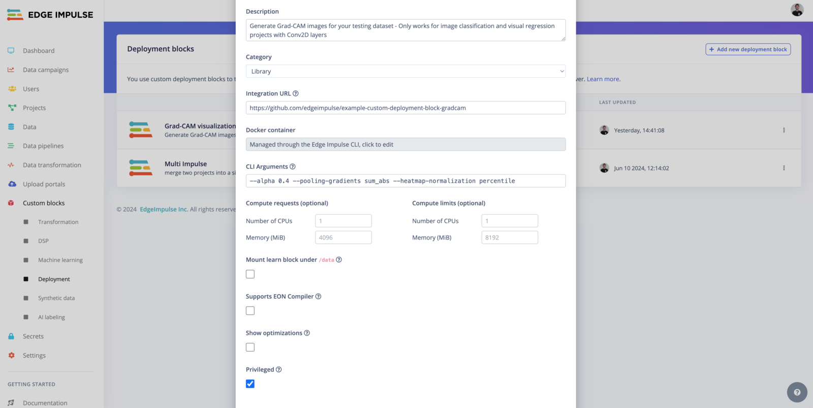 To use your custom block within your project, head to the Deployment page and select the Grad-CAM visualization option, the output will be a .zip file containing your test dataset with the Grad-Cam overlay.